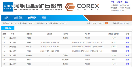 6月22日,由北鐵中心與河鋼共同打造的礦石超市業務板塊上線運行,當日申報47筆共計257.67萬噸,其中成交7筆共計48.15萬噸。