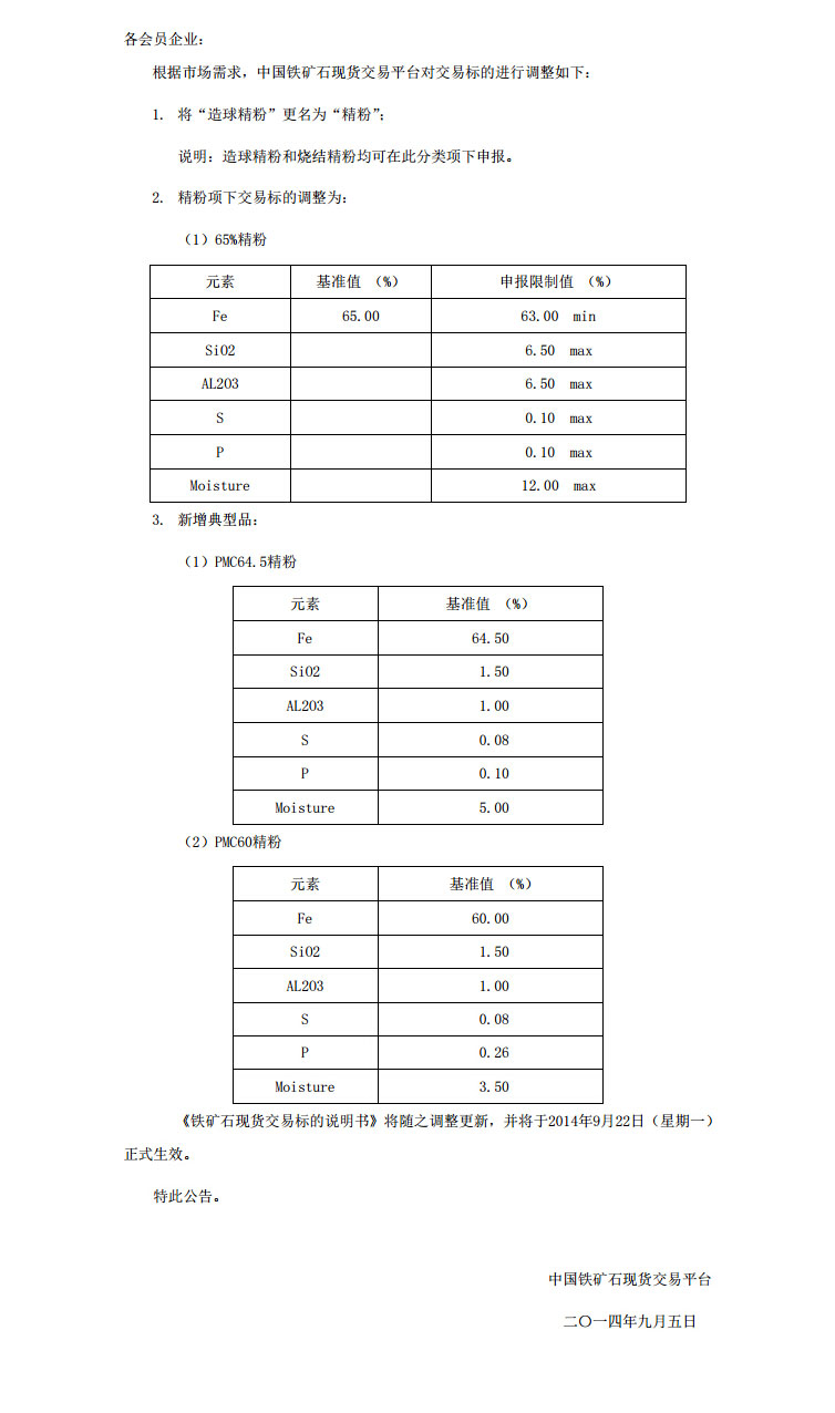 中國鐵礦石現貨交易平臺關于調整交易標的的公告