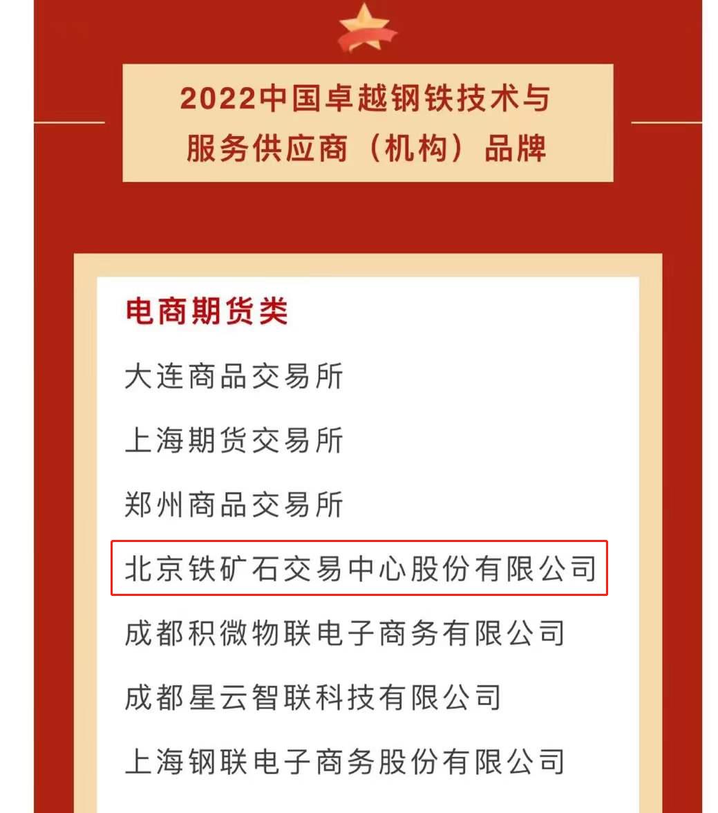2022年5月10日,北京鐵礦石交易中心(簡稱“北鐵中心”)在中國冶金報社組織的2022年度中國鋼鐵品牌評選中榮獲“2022中國卓越鋼鐵技術與服務供應商(機構)品牌”稱號。