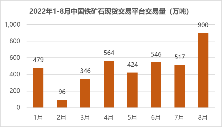 2022年8月,鐵礦石現貨市場活躍度顯著回升,中國鐵礦石現貨交易平臺(簡稱“平臺”)交易量達到900萬噸,其中在途現貨(美元)交易量455萬噸,港口現貨(人民幣)交易量445萬噸,港口現貨板塊首次月成交突破400萬噸。