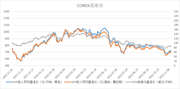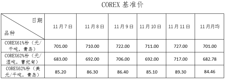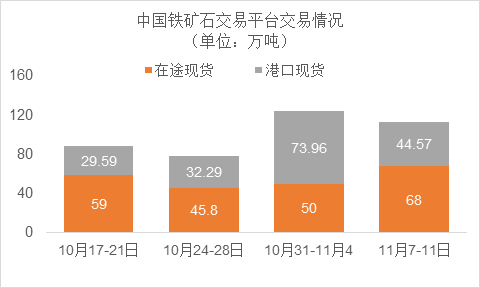 11月7日~11月11日成交61筆共112.57萬噸,其中在途5筆共68萬噸,港口56筆共44.57萬噸。主要成交品種包括:PB粉16筆共41.9萬噸,麥克粉4筆共3萬噸,金布巴混合粉6筆共4.6萬噸,紐曼塊2筆共17萬噸,BRBF 2筆共18萬噸,F(xiàn)MG混合粉3筆共2.5萬噸,F(xiàn)MG超特粉3筆共2.45萬噸。