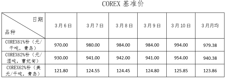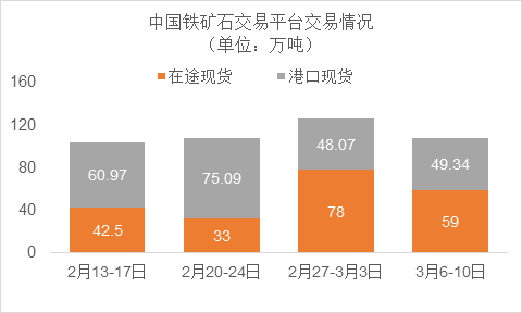 3月6日~3月10日成交50筆共108.34萬噸,其中在途4筆共59萬噸,港口46筆共49.34萬噸。主要成交品種包括:PB粉18筆共21.09萬噸,PB塊2筆共10萬噸,金布巴混合粉5筆共16.5萬噸,麥克粉4筆共21.8萬噸,BRBF 1筆共17萬噸,卡拉加斯粉2筆1.55萬噸,FMG混合粉4筆共4萬噸。