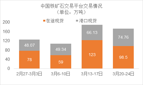 3月20日~3月24日成交79筆共173.26萬噸,其中在途9筆共98.5萬噸,港口70筆共74.76萬噸。主要成交品種包括:PB粉20筆共63.7萬噸,金布巴混合粉5筆共5萬噸,麥克粉2筆共2.2萬噸,揚迪粉3筆共12萬噸,卡拉加斯粉9筆17.8萬噸,FMG混合粉5筆共4萬噸。