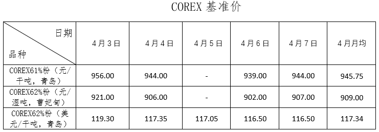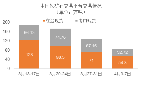 4月3日~4月7日成交38筆共87.02萬(wàn)噸,其中在途5筆共54.3萬(wàn)噸,港口33筆共32.72萬(wàn)噸。主要成交品種包括:PB粉14筆共13.95萬(wàn)噸,金布巴混合粉1筆共8萬(wàn)噸,麥克粉2筆共2.2萬(wàn)噸,揚(yáng)迪粉2筆共4萬(wàn)噸,卡拉加斯粉3筆2.54萬(wàn)噸,BRBF 1筆共8.5萬(wàn)噸,F(xiàn)MG混合粉3筆共19.8萬(wàn)噸。