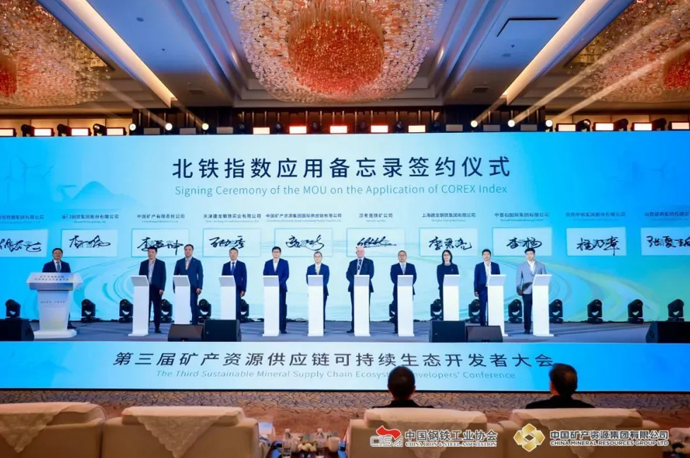 11月6日,在第三屆礦產資源供應鏈可持續生態開發者大會上,中國礦產資源集團國際供應鏈有限公司、上海德龍鋼鐵集團有限公司、天津建龍鋼鐵實業有限公司、廈門國貿集團股份有限公司等10家鋼鐵產業鏈上下游重點企業共同簽署北鐵指數應用備忘錄,將逐步在鐵礦石貿易中采用北鐵指數作為結算依據。